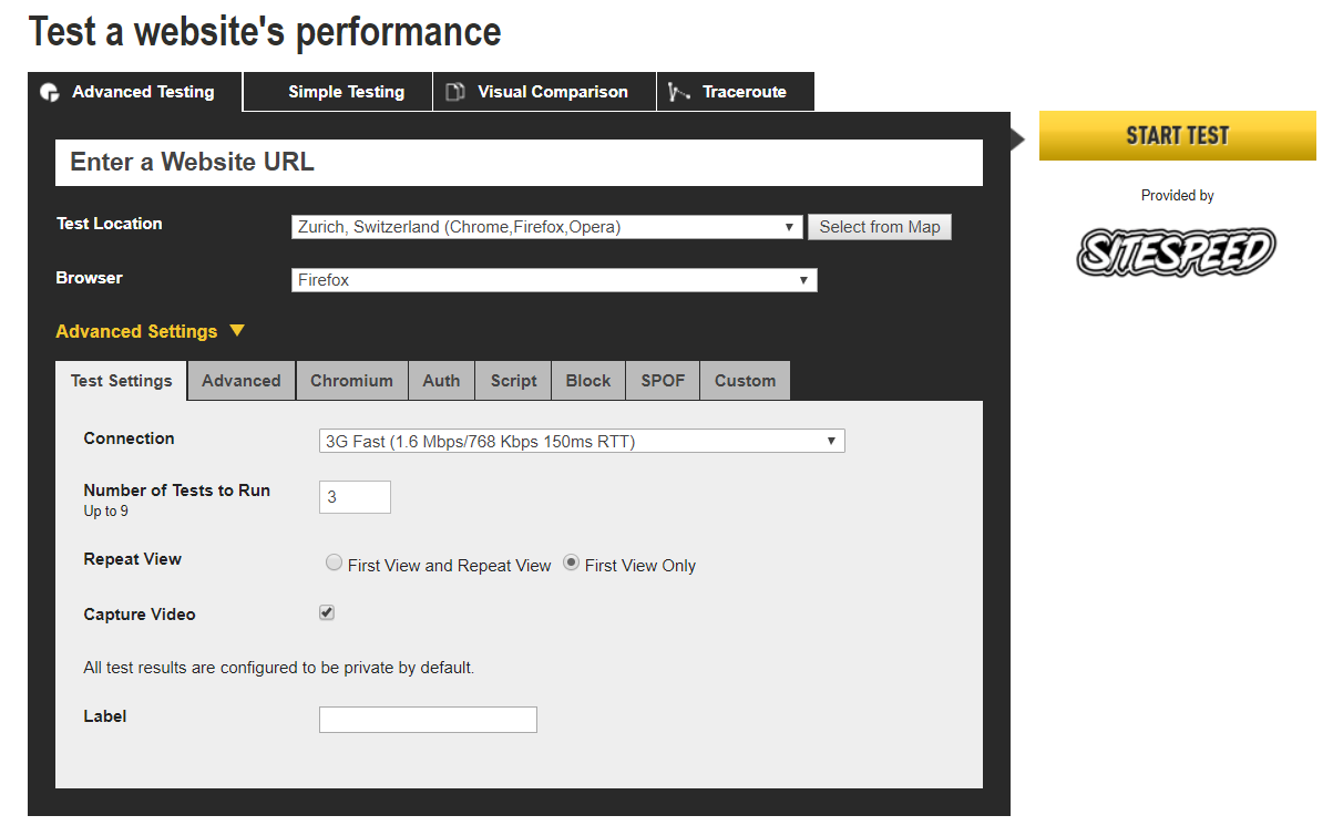 Эта платформа позволяет запускать тесты в разных браузерах и с разной скоростью соединения. Имеет расширенные настройки и отображает карту загрузки элементов сайта, что помогает выявить "узкие места".